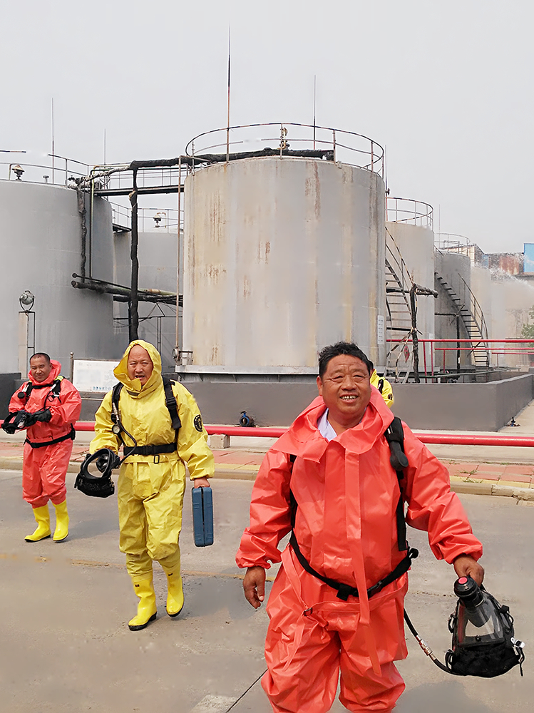 硝基苯車(chē)間巡檢員在例行巡檢時(shí)發(fā)現(xiàn)儲(chǔ)罐區(qū)苯三號(hào)罐閥門(mén)泄露,用對(duì)講機(jī)立即報(bào)告車(chē)間安全值班員。車(chē)間班組維修人員當(dāng)即到現(xiàn)場(chǎng)搶修,由于閥門(mén)泄露情勢(shì)比較嚴(yán)重,黃色的苯霧蔓延,隨時(shí)會(huì)發(fā)生著火危險(xiǎn)。帶隊(duì)班長(zhǎng)立即請(qǐng)示車(chē)間搶險(xiǎn)防爆隊(duì)支援搶修,在防爆搶修過(guò)程中,事態(tài)嚴(yán)重,一人暈倒。車(chē)間搶險(xiǎn)隊(duì)長(zhǎng)立即上報(bào)虹橋公司值班調(diào)度。值班調(diào)度迅泄漏應(yīng)急救援預(yù)案,各應(yīng)急救援小組人員迅速奔赴現(xiàn)場(chǎng)。虹橋公司搶險(xiǎn)防暴隊(duì)人員立即開(kāi)啟四個(gè)應(yīng)急消防水泵,伴隨著警報(bào)聲,白色的水龍從四個(gè)方向“箭”似噴射向苯儲(chǔ)罐和泄露罐閥門(mén)著火點(diǎn),苯霧迅即被稀釋,搶修人員成功對(duì)泄漏閥門(mén)進(jìn)行了堵漏;同時(shí)保衛(wèi)警戒組拉起了隔離帶,勸導(dǎo)、疏散閑雜人員;醫(yī)療救護(hù)組抬出受傷人員至安全區(qū)迅速進(jìn)行初期救護(hù)……整個(gè)救援搶險(xiǎn)緊張有序地進(jìn)行演練完成。